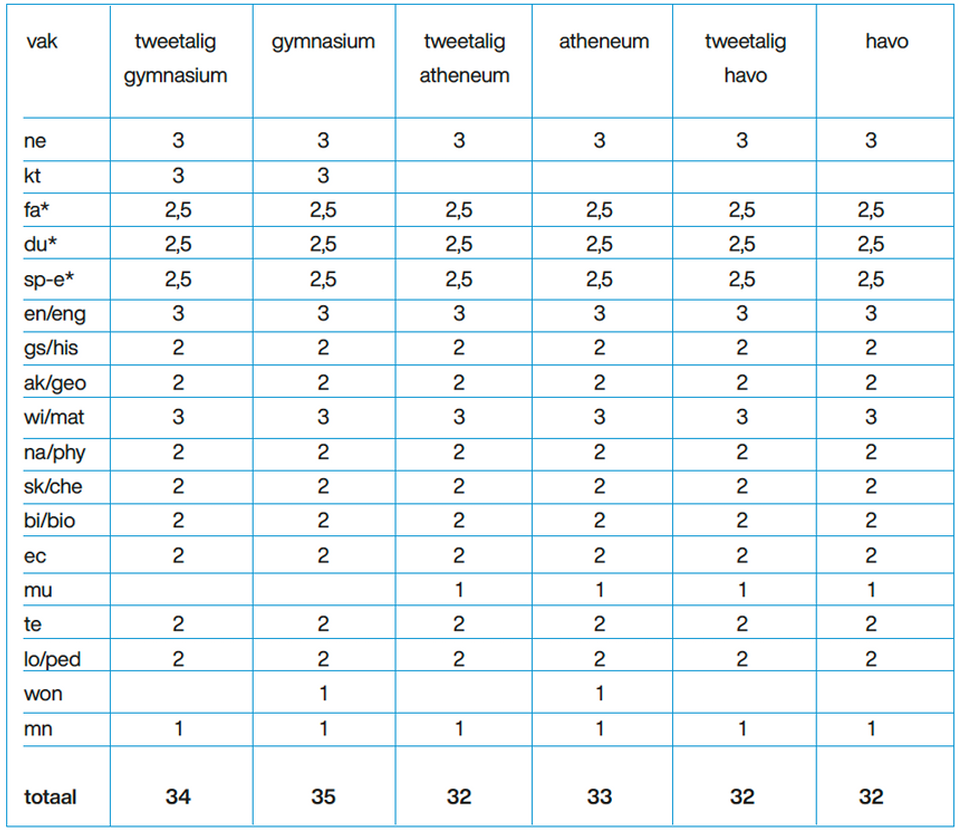 * Leerlingen (t)vwo/(t)havo volgen twee talen uit Spaans-Duits-Frans = totaal 5 uur
